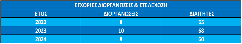 - 2024: 8 διοργανώσεις – 60 διαιτητές